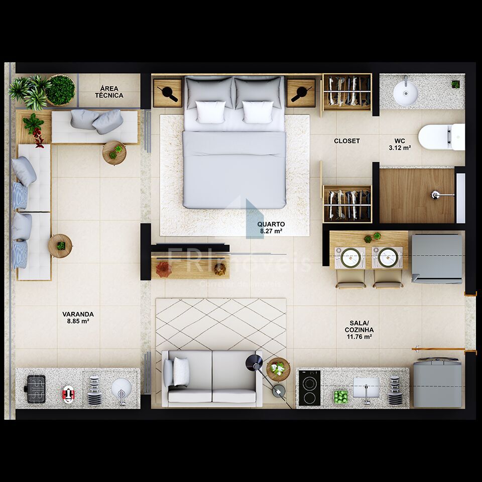 1 Dormitório, sendo 1 suíte1 Banheiro1 VagaGaragem Coberta1 Sala de TV1 Cozinha1 Sala de jantar